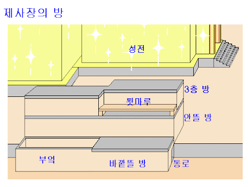 (3) 그 방 삼층에 툇마루들이 있는데 한 방의 툇마루는 이십 척 되는 안 뜰과 마주 대하였고 한 방의 툇마루는 바깥 뜰 박석 깔린 곳과 마주 대하였으며